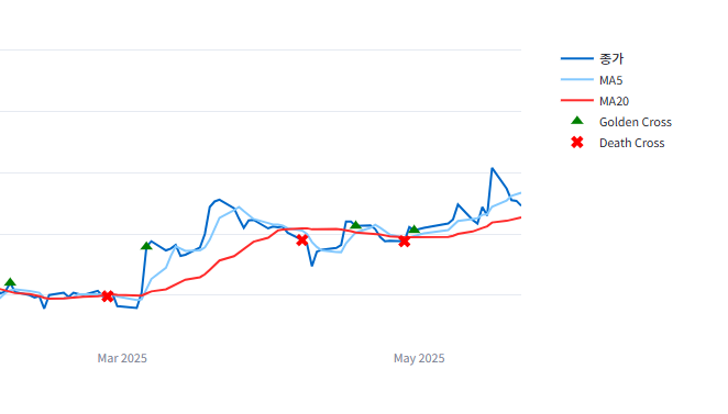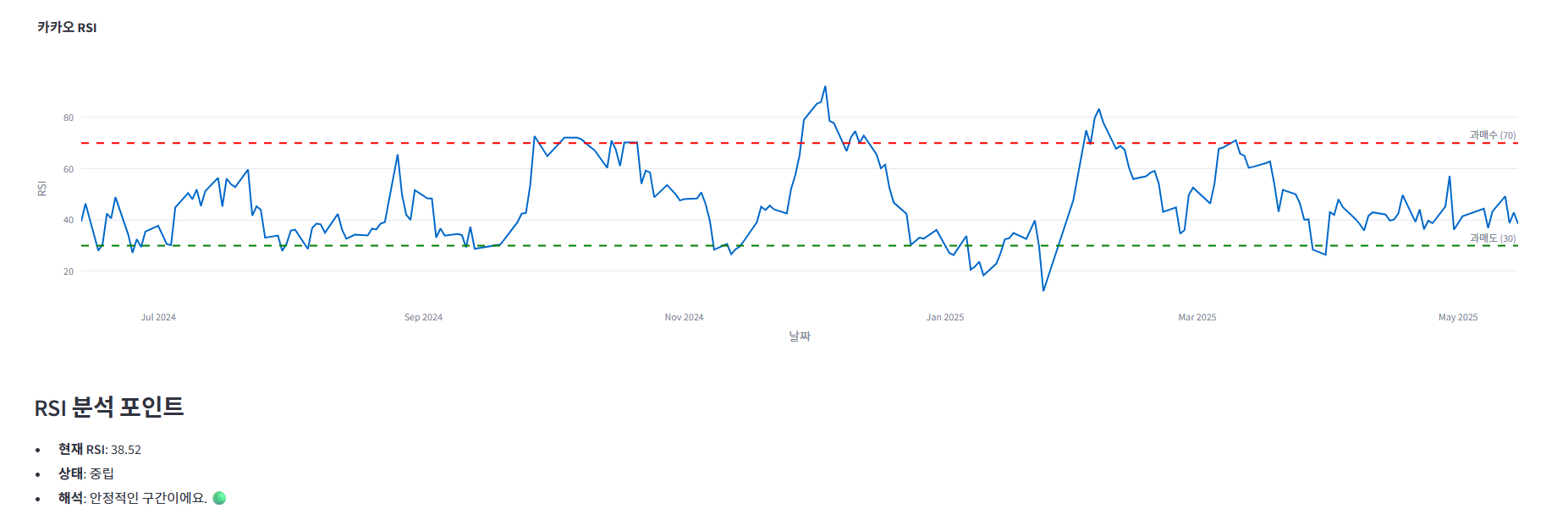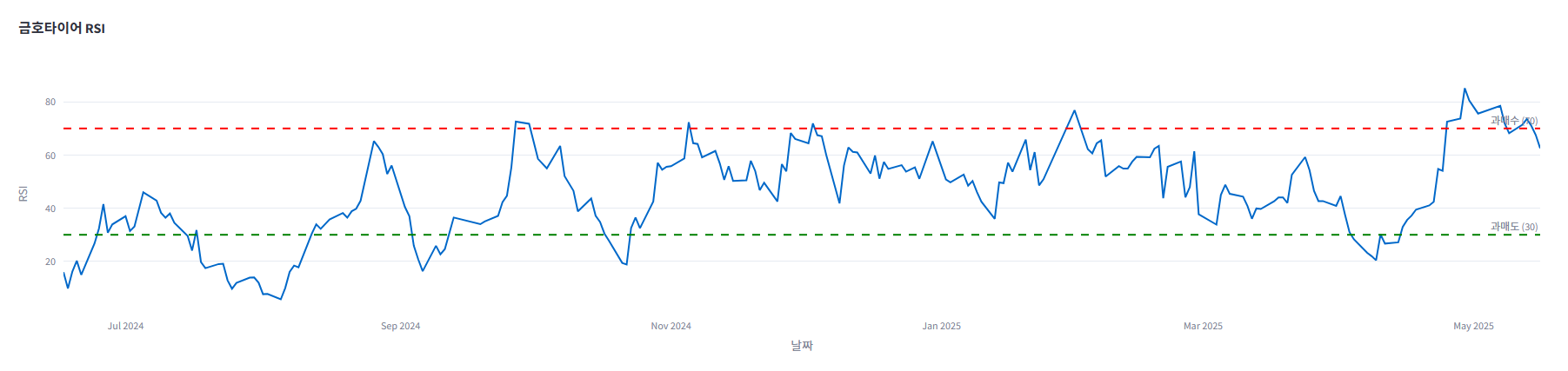 📅 2025년 05월 30일 | TINA 투자리포트📈 상위 5개 추천 종목 (AI 기반 분석)🔹 금호타이어현재 주가: 4,430원보수적 매수: 4,341원공격적 매수: 4,407원보수적 매도: 4,651원공격적 매도: 4,562원손절가: 4,208원시장 심리: 0.49종합 점수: 0.66📊 기술 지표 해석:RSI: 36.96 → 안정MACD: -108.85 vs Signal: -72.77 → 하락 신호TEMA: 현재가 4430.00, TEMA 4270.90 → 상승 흐름추천 이유 요약:RSI는 중립 구간에 위치해 과열 우려는 낮습니다. MACD는 시그널선 하회로 단기 약세 전환 가능성을 시사합니다. 현재 주가는 TEMA 상단에 위치해 상승 추세가 이어질 가능성이 있습니다. 시장 심리는 중립 또는 ..
