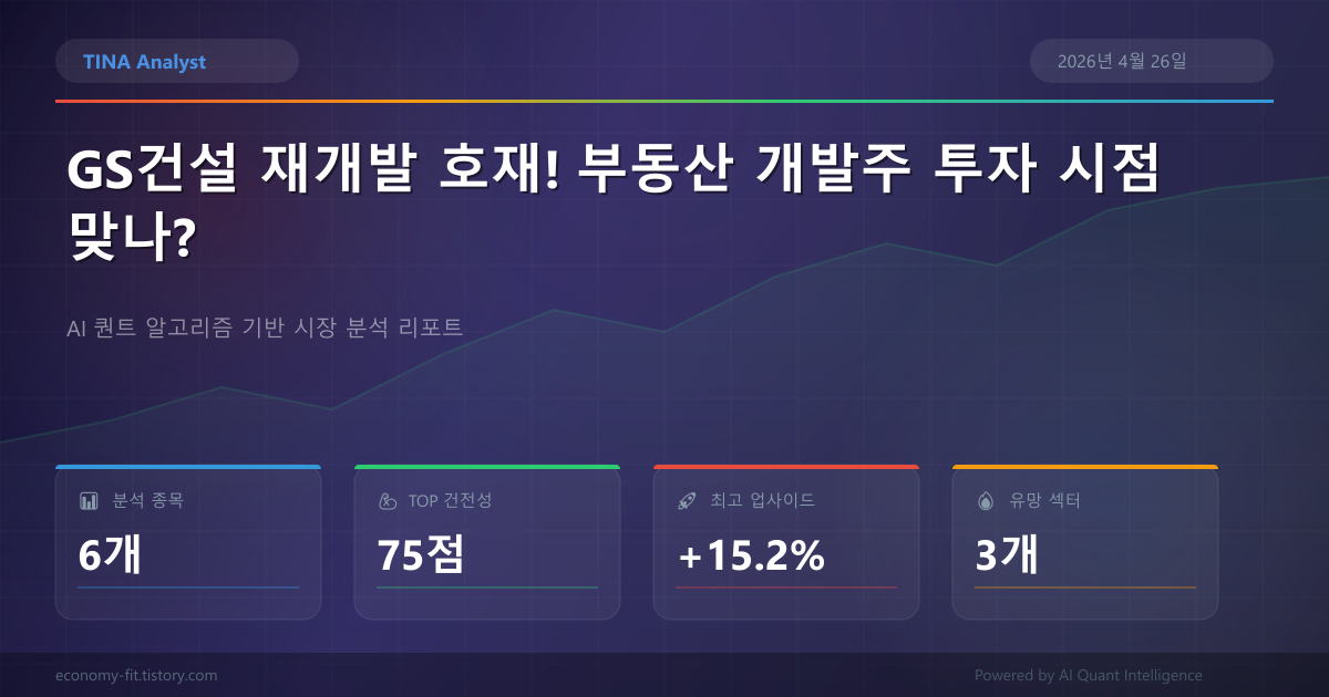 GS건설, 현대건설 주가 상승 기대! 재개발 사업 활발, 투자 전략 필요.📊 오늘의 시장 분석 — 2026년 4월 26일2026년 4월 26일, GS건설과 현대건설이 부동산 개발 섹터에서 주목받고 있습니다. 오늘 주식 시장에서는 재개발 및 재건축 프로젝트가 활발히 진행되고 있다는 소식과 함께, 이들 종목의 전망이 관심을 끌고 있습니다. 증시 전망에 따라 부동산 개발 섹터에 대한 투자 전략이 필요합니다.시장 온도😐 혼조평균 건전성 42점분석 종목6개3개 섹터최고 건전성삼성전자75점최고 업사이드삼성전자+15.2%📑 목차📈 섹터별 투자 분석└ 부동산 개발└ 게임└ 경제 외교📊 차트 분석🔍 퀀트 지표 상세🏆 오늘의 PICK💰 투자 전략📰 참고 뉴스📈 섹터별 투자 분석🔥 1. 부동산 개발 섹터..