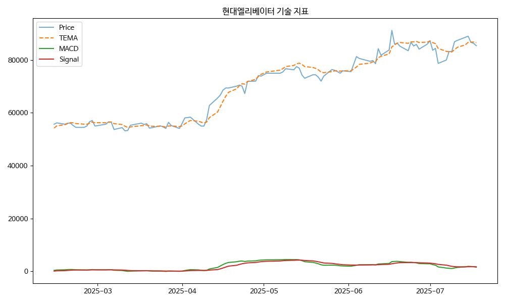 현대엘리베이터 주가 차트 (2025년 7월 20일 기준) - 국내 1위 스마트 엘리베이터 기업, MACD 하락세 지속.