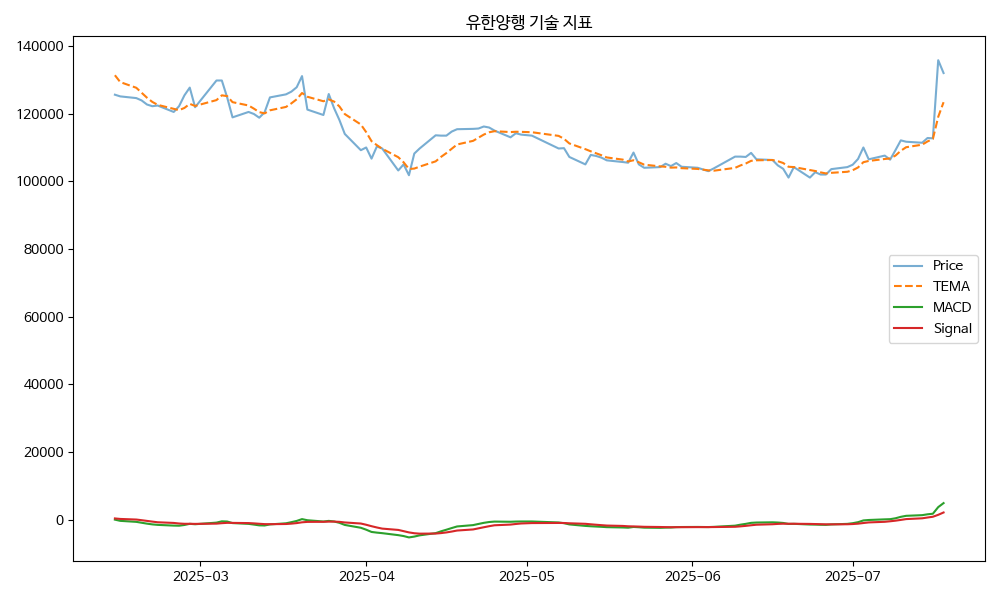 유한양행 주가 차트 (2025년 7월 20일 기준) - 항암제 피하주사 미국 허가 기대감, MACD 상승 및 TEMA 강세 흐름.