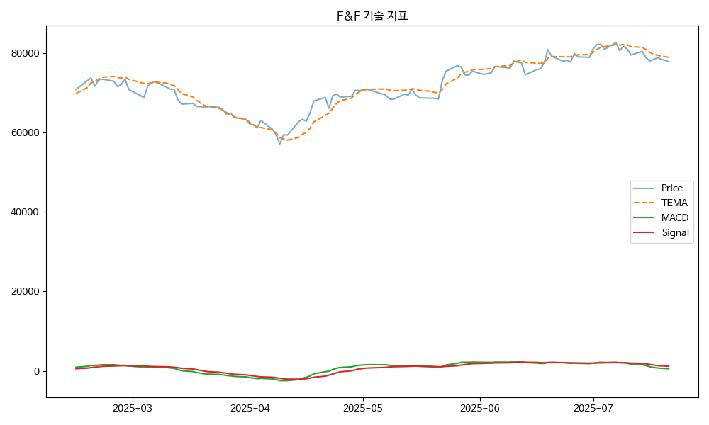 - TEMA: 현재가 77900.00, TEMA 79015.35 → 하락 흐름