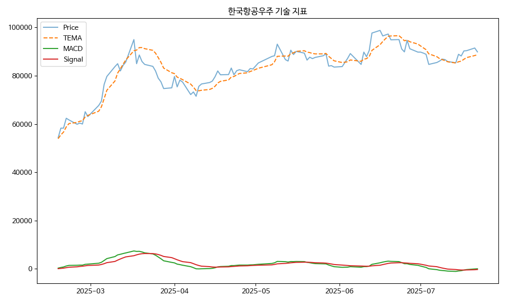 한국항공우주 주가 분석 차트 (2025년 7월 22일 기준) - 누리호 기술 이전 기대감 반영, MACD 상승 및 TEMA 우상향.