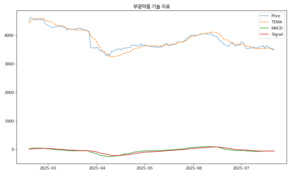 부광약품 주가 차트 (2025년 7월 22일 기준) - 2분기 흑자 전환 및 기술적 안정 흐름, MACD 하락 및 TEMA 하락세.