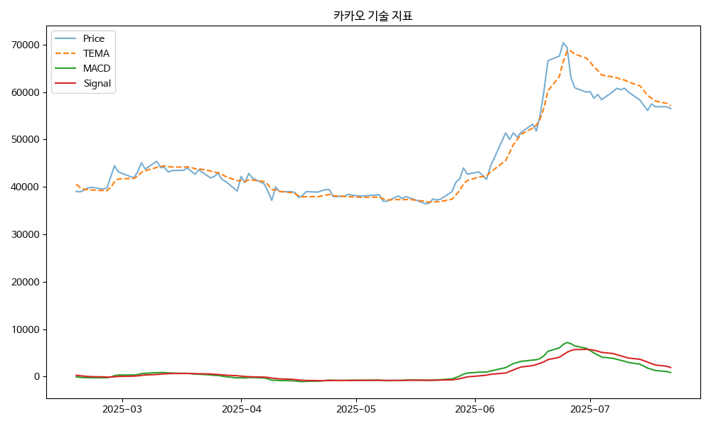 뉴스 감성 점수는 0.68로 나왔는데, 긍정적인 뉴스가 상대적으로 많았음을 의미합니다. 따라서 현재 카카오에 대한 긍정적인 분위기가 형성되어 있다고 볼 수 있습니다. 이러한 정보들을 종합해보면, 카카오 주식이 상승할 가능성이 높다는 것을 알 수 있습니다. 하지만 투자에 앞서 기술 지표와 뉴스를 함께 고려하여 신중한 판단이 필요합니다.