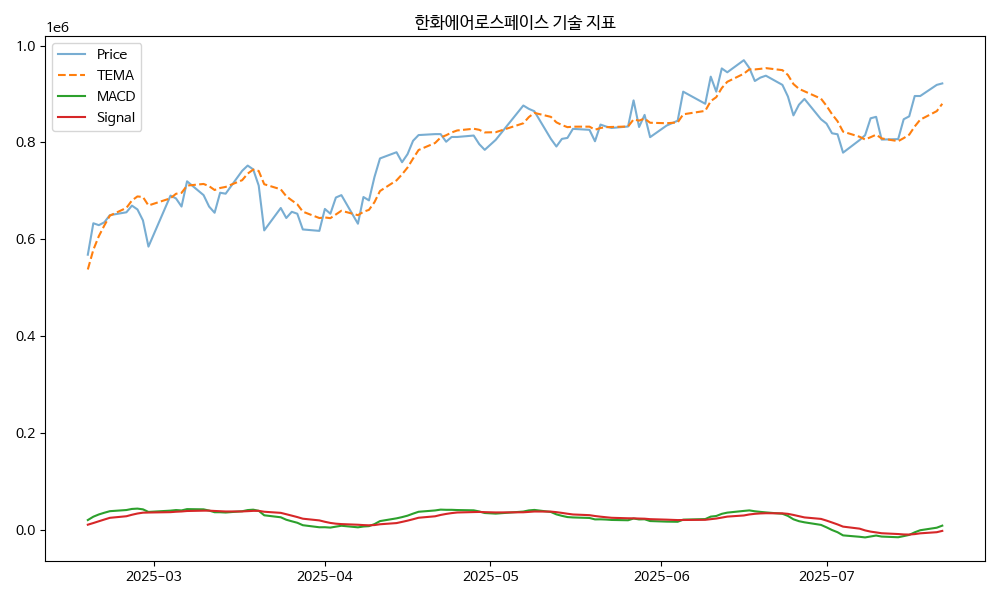 한화에어로스페이스 주가 차트 (2025년 7월 22일 기준) - 누리호 관련 협상 뉴스 영향, MACD 및 TEMA 상승 흐름 지속.