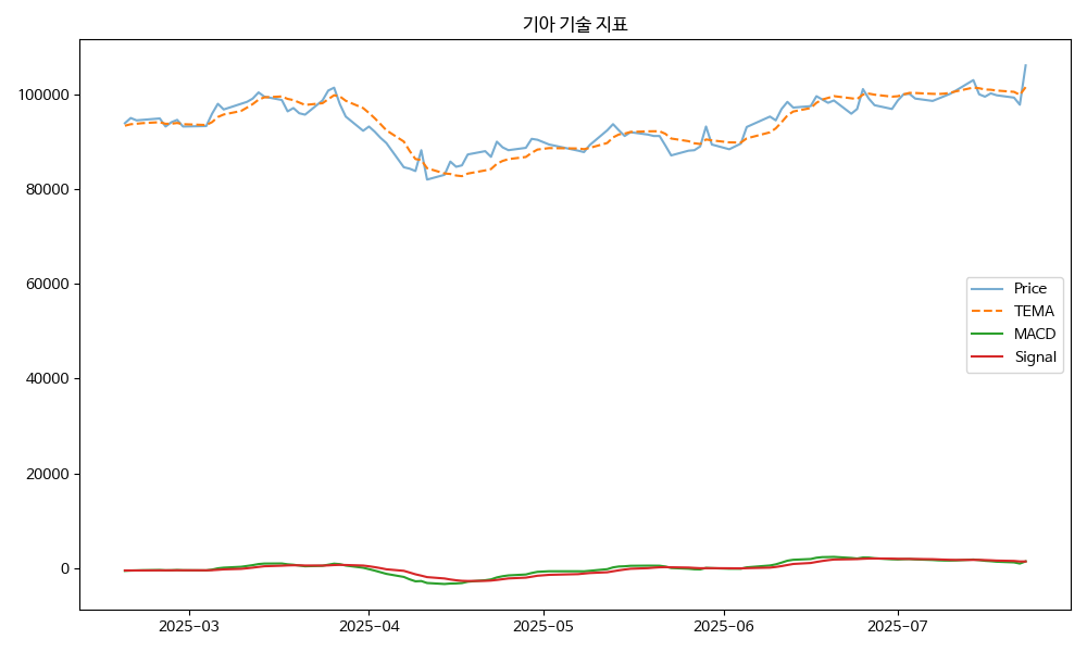 기아 주가 차트 (2025년 7월 23일 기준) - 일본·미국 관세 협상 타결 수혜, MACD 상승 및 TEMA 강세 흐름.