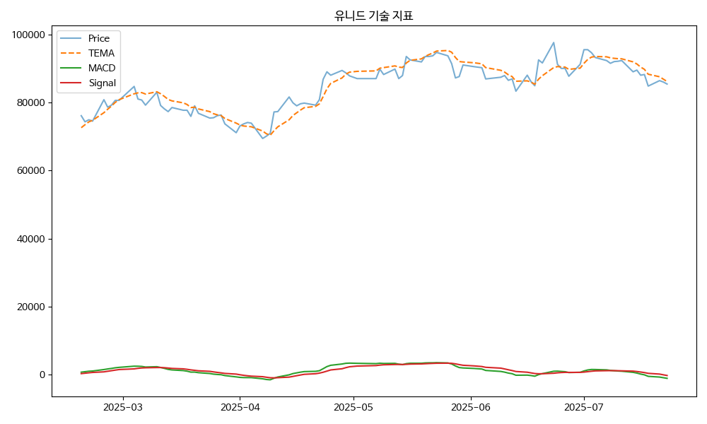 • TEMA: 현재가 85400.00, TEMA 86137.85 → 하락 흐름