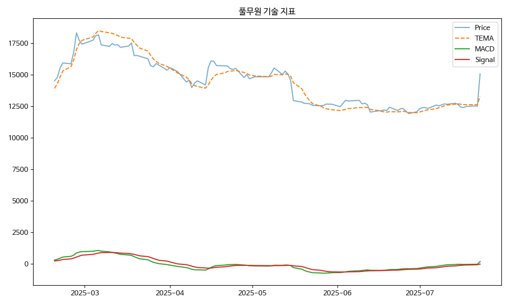• TEMA: 현재가 15050.00, TEMA 13263.26 → 상승 흐름