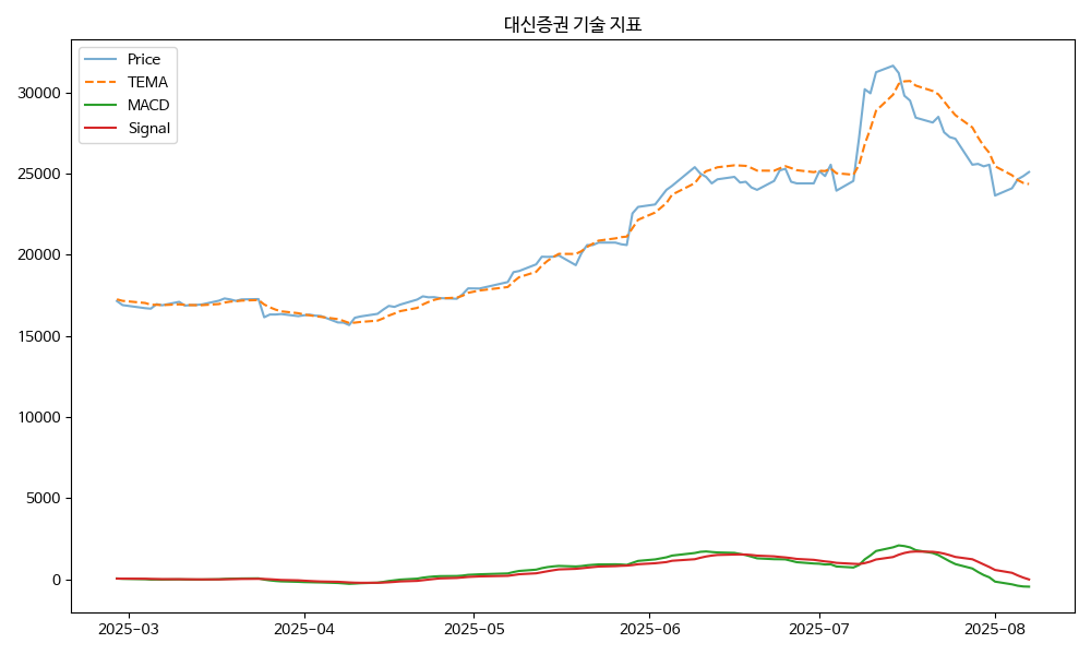 - TEMA: 현재가 25100.00, TEMA 24357.92 → 상승 흐름