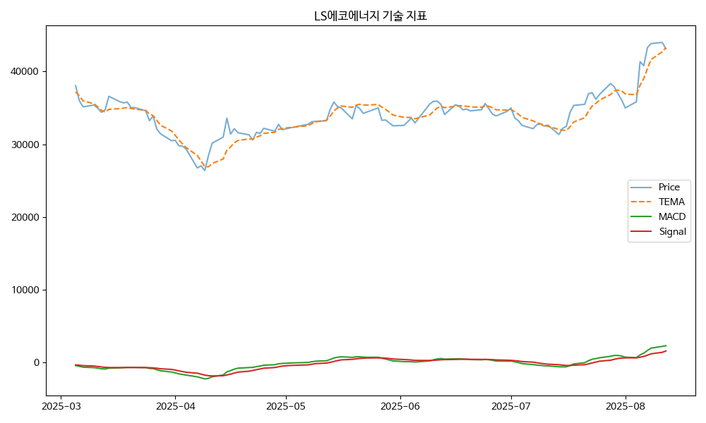 LS에코에너지 주가 차트 (2025년 8월 13일 기준) - 해저케이블 공장 건설 추진, MACD 상승세 유지.