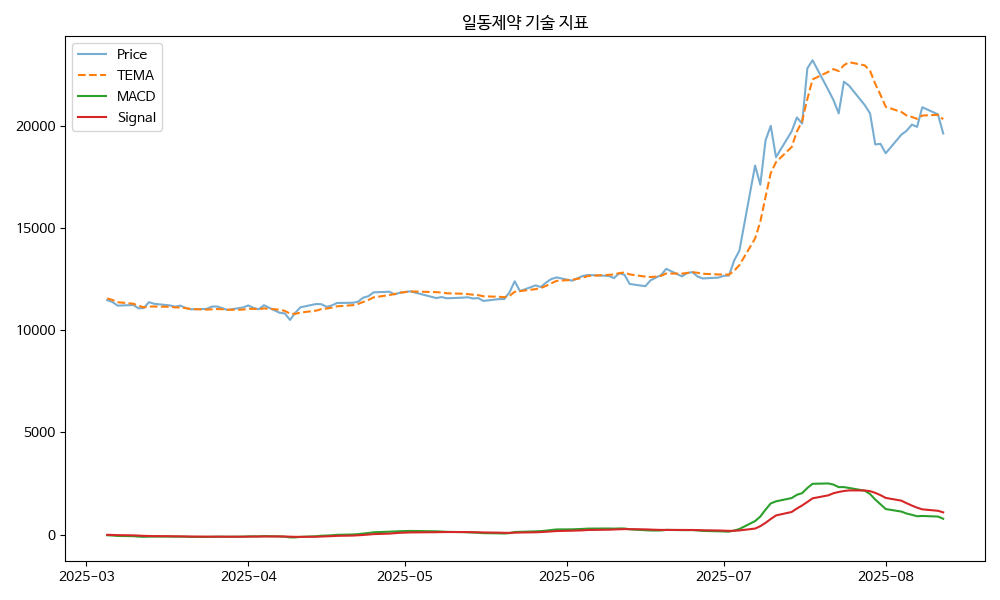 일동제약 주가 차트 (2025년 8월 13일 기준) - '이중 ADC' 항암 신약 공동개발 소식, MACD 하락 및 TEMA 하락 흐름.