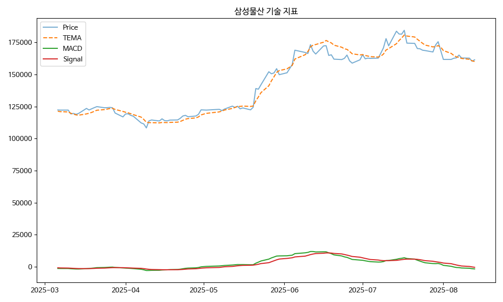 삼성물산 주가 분석 차트 (2025년 8월 13일 기준) - 우미건설과 주거 서비스 협력, MACD 하락이나 TEMA 상승 전환.