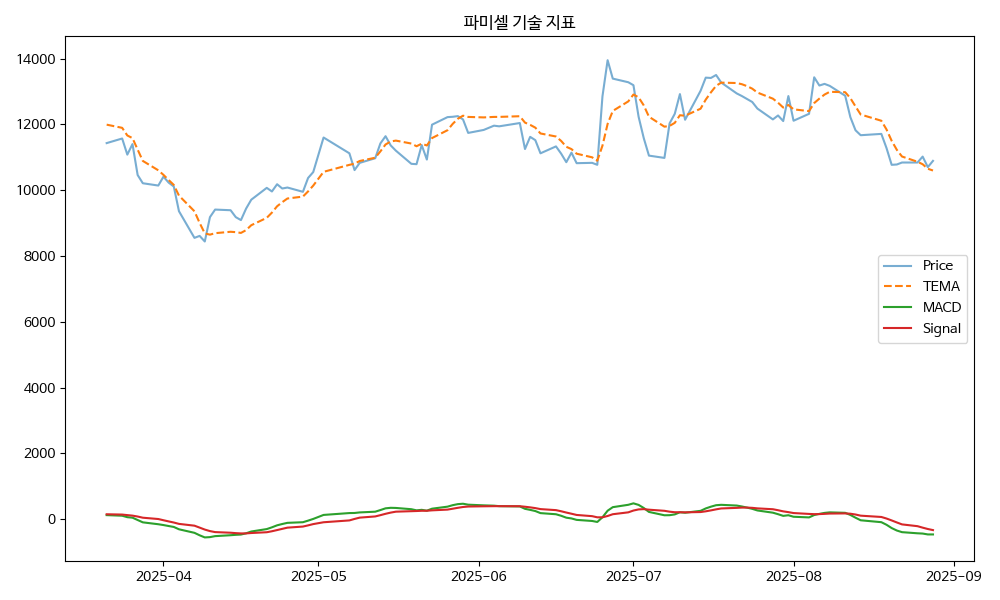 - TEMA: 현재가 10890.00, TEMA 10596.70 → 상승 흐름