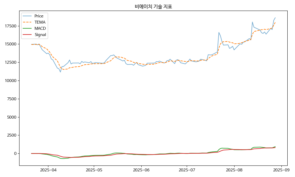 - TEMA: 현재가 18610.00, TEMA 17976.67 → 상승 흐름