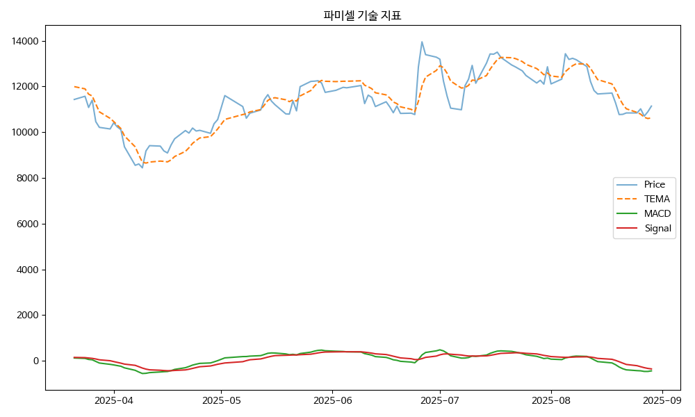 파미셀 주가 차트 (2025년 9월 1일 기준) - 줄기세포·케미칼 사업 기대, RSI 20 과매도 구간, MACD 하락 신호, TEMA 상승 흐름.