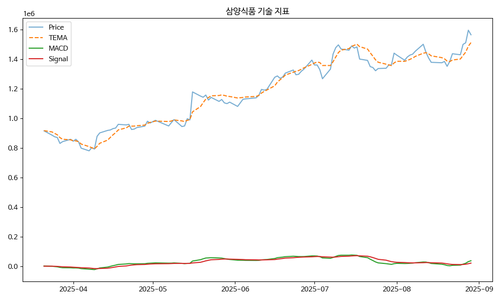 삼양식품의 주가가 최근에 상승세를 보이고 있습니다. 이는 '불닭 신화' 제품의 인기로 인한 것으로 보고 있습니다. 주가는 글로벌 시장 확장 기대감에 힘입어 상승하고 있습니다. 기술적으로는 Golden Cross와 MA Ratio가 상승 추세를 보여줍니다. 또한, Force Index와 Momentum 5도 양호한 상태를 유지하고 있습니다. 이러한 기술 지표들이 주가 상승을 뒷받침하고 있습니다.