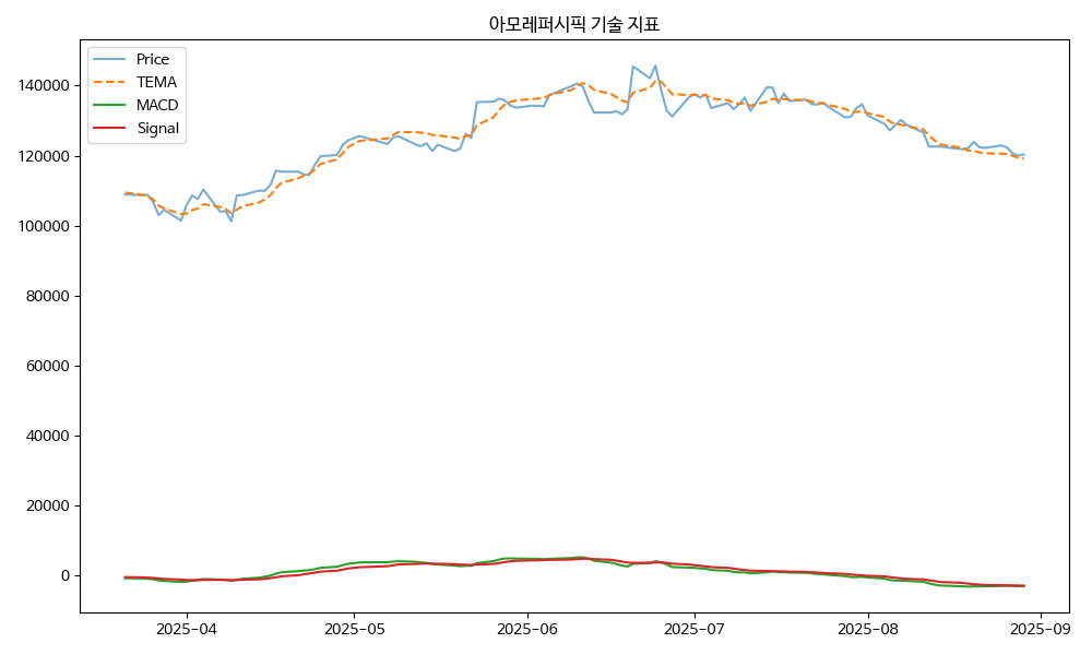 뉴스 감성 점수는 0.95로 매우 높게 평가되었는데, 이는 긍정적인 뉴스가 많이 보도되고 있음을 나타냅니다. 종합적으로 보면, 아모레퍼시픽의 주가가 상승할 것으로 예상됩니다. 종목에 관심이 있는 투자자라면 기술 지표와 뉴스를 주의깊게 살펴보고 투자 결정을 내리는 것이 좋을 것입니다.