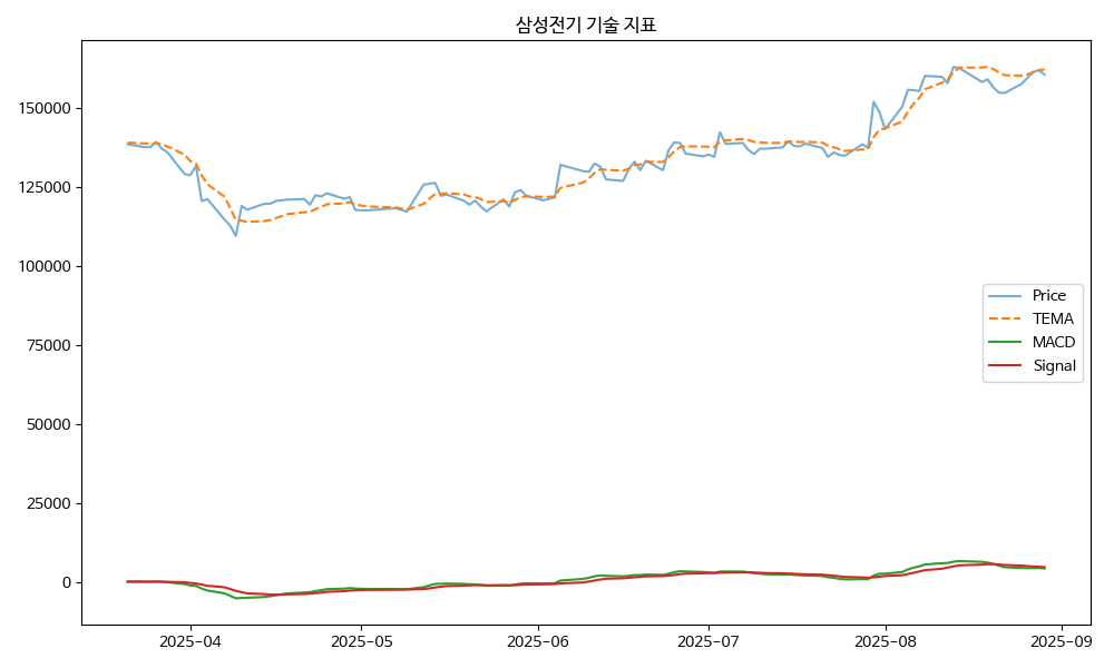 삼성전기 주가 분석 차트 (2025년 9월 1일 기준) - 엔비디아 블랙웰 MLCC 공급 이슈, RSI 50 안정, MACD 하락 신호, TEMA 하락세.