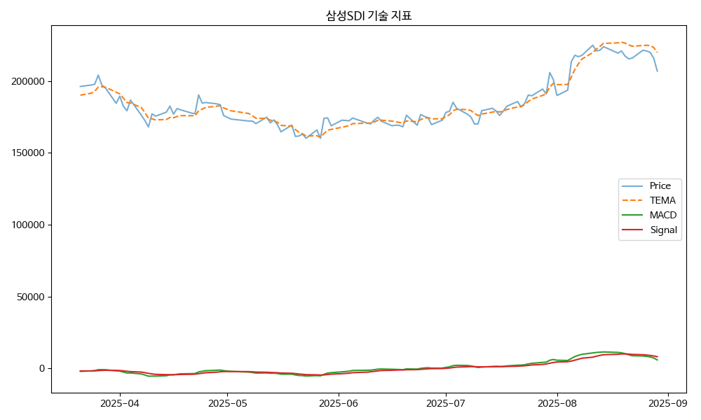 • TEMA: 현재가 207000.00, TEMA 219890.39 → 하락 흐름