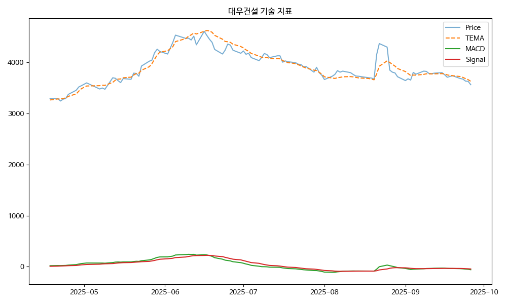 대우건설 주가 분석 차트 (2025년 9월 29일 기준) - 삼성물산과 9천억대 문래동 재개발 수주, RSI 13 과매도, MACD 하락 신호, TEMA 하락세.