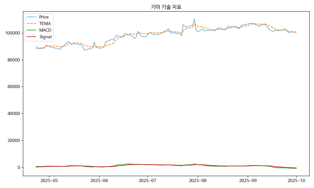 기아 주가 차트 (2025년 10월 2일 기준) - 9월 판매량 26만8천대, 역대 3분기 최대 기록, RSI 25 과매도, MACD 하락 신호, TEMA 상승 흐름.