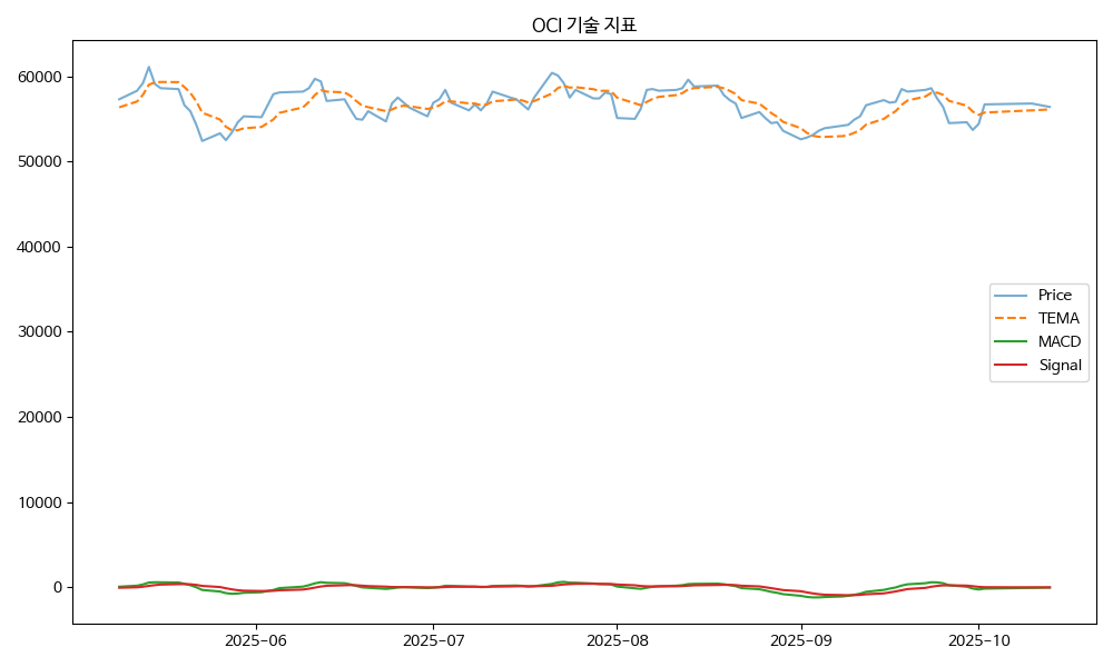 - TEMA: 현재가 56400.00, TEMA 56107.35 → 상승 흐름