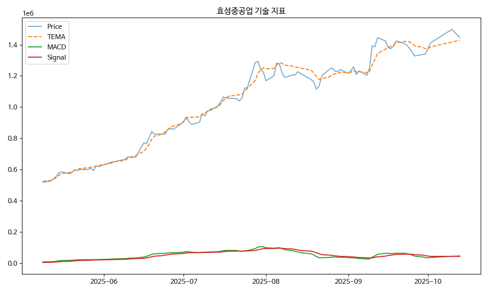 효성중공업은 최근 업종 내에서 가장 높은 이익 성장률을 보이고 있어, 한국투자증권이 목표주가를 180만원으로 상향 조정했습니다. 이는 긍정적인 신호로 해석될 수 있습니다. 주가 기술 지표에서는 Golden_Cross(골든크로스), MA_Ratio(이동평균 비율), Force_Index(포스지수), VWAP(가중 평균 가격), Momentum_5(모멘텀 5일)가 주요하게 작용하고 있는 것으로 나타났습니다.