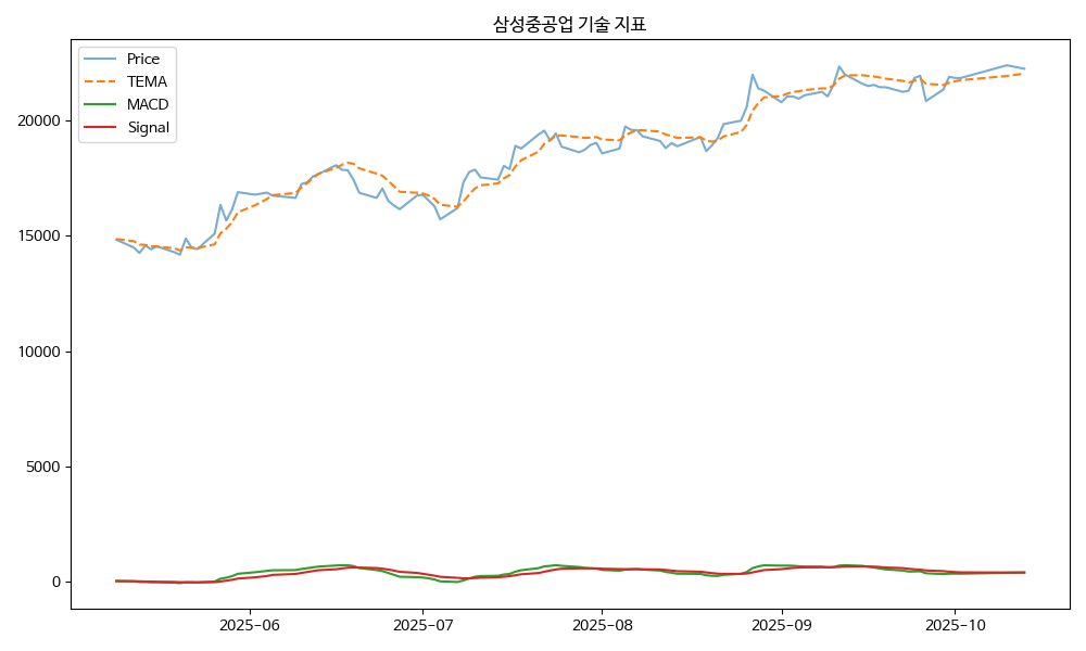 - TEMA: 현재가 22250.00, TEMA 22041.89 → 상승 흐름
