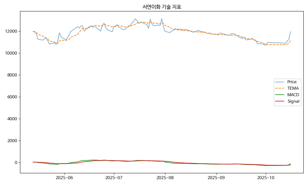 - TEMA: 현재가 11950.00, TEMA 11145.17 → 상승 흐름