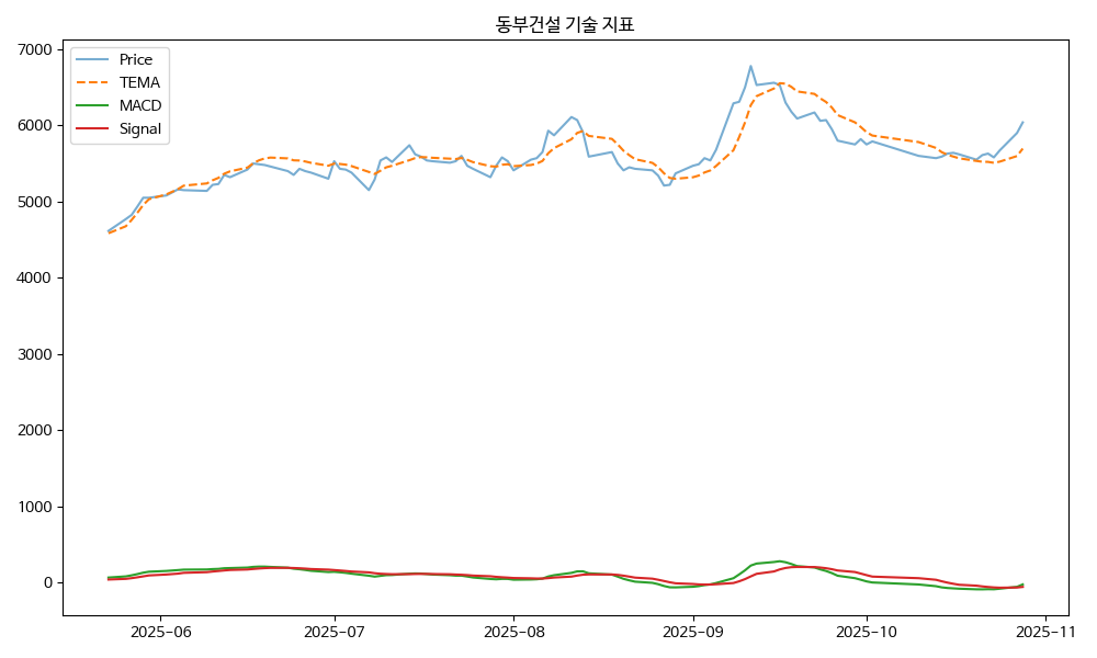동부건설 주가 분석 차트 (2025년 10월 29일 기준) - 삼성전자 스마트 물류센터 단독 수주 뉴스, RSI 64 안정 구간, MACD 상승 신호, TEMA 상승 흐름.
