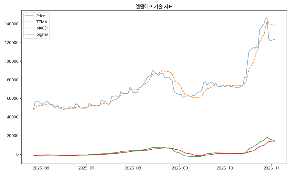 엘앤에프 주가 분석 차트 (2025년 11월 4일 기준) - 2차전지 양극재 전문기업, 니켈복합계 기술 경쟁력 강화. RSI 70 과매수 구간, MACD 상승 신호, TEMA 하락 흐름.