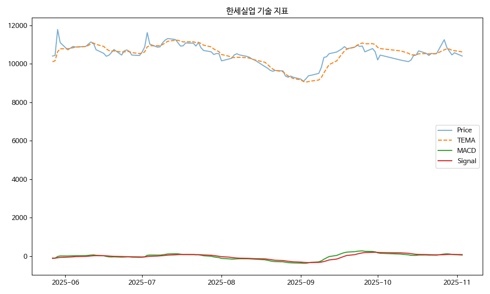 한세실업 주가 차트 (2025년 11월 4일 기준) - ‘탄소 제로’ 시험 추진 및 글로벌 진출 기대감, RSI 53 안정 구간, MACD 하락 신호, TEMA 하락 흐름.