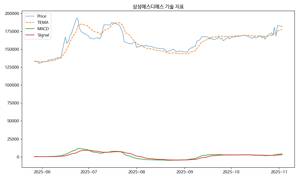삼성에스디에스 주가 분석 차트 (2025년 11월 4일 기준) - 삼성전자·엔비디아 협력 수혜 기대감, RSI 61 안정 구간, MACD 상승 신호, TEMA 상승 흐름.