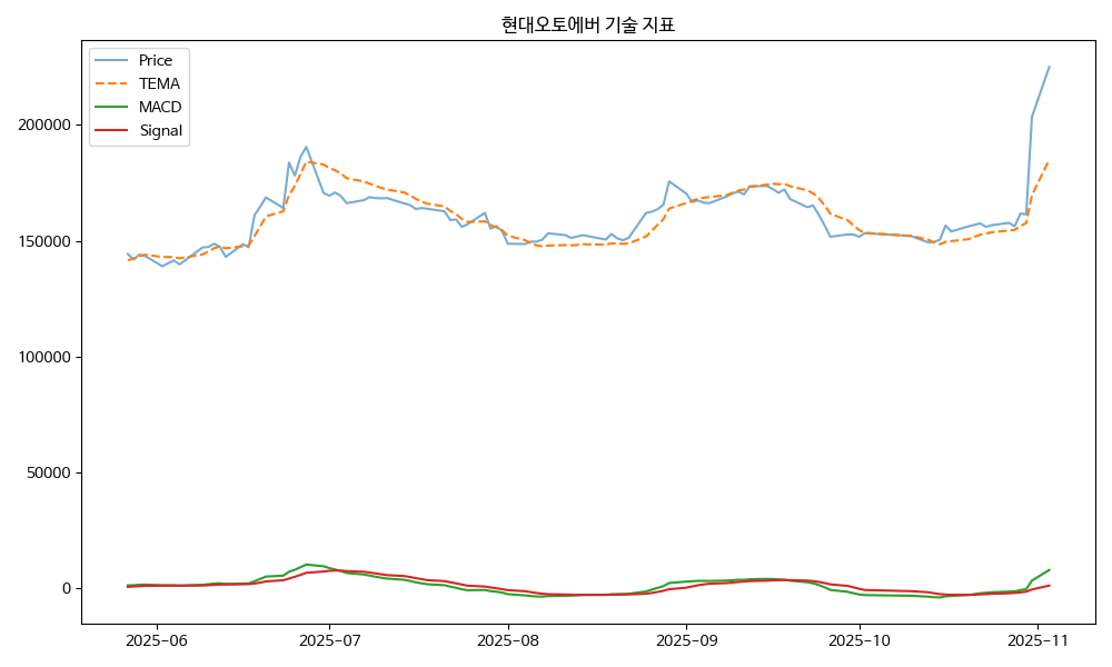 • TEMA: 현재가 225000.00, TEMA 184947.17 → 상승 흐름
