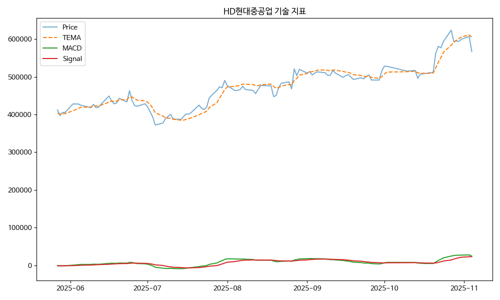 - TEMA: 현재가 567000.00, TEMA 604557.33 → 하락 흐름