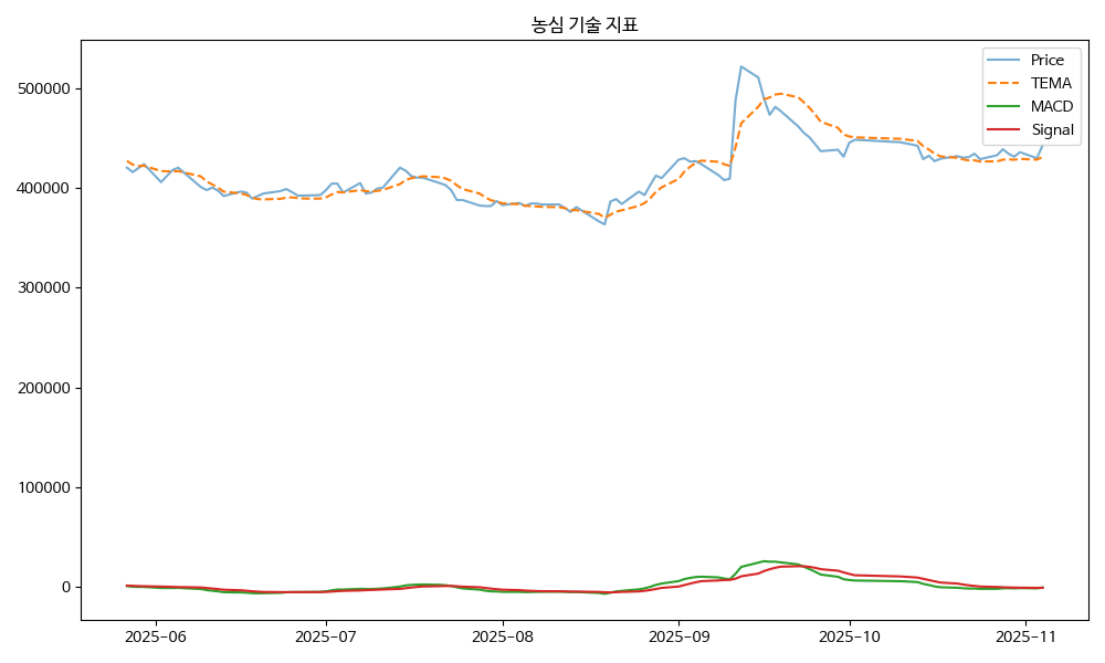 - TEMA: 현재가 443000.00, TEMA 431311.68 → 상승 흐름