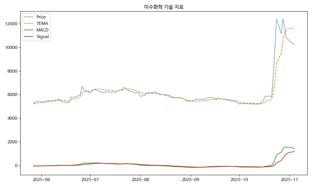 - TEMA: 현재가 10250.00, TEMA 11568.67 → 하락 흐름