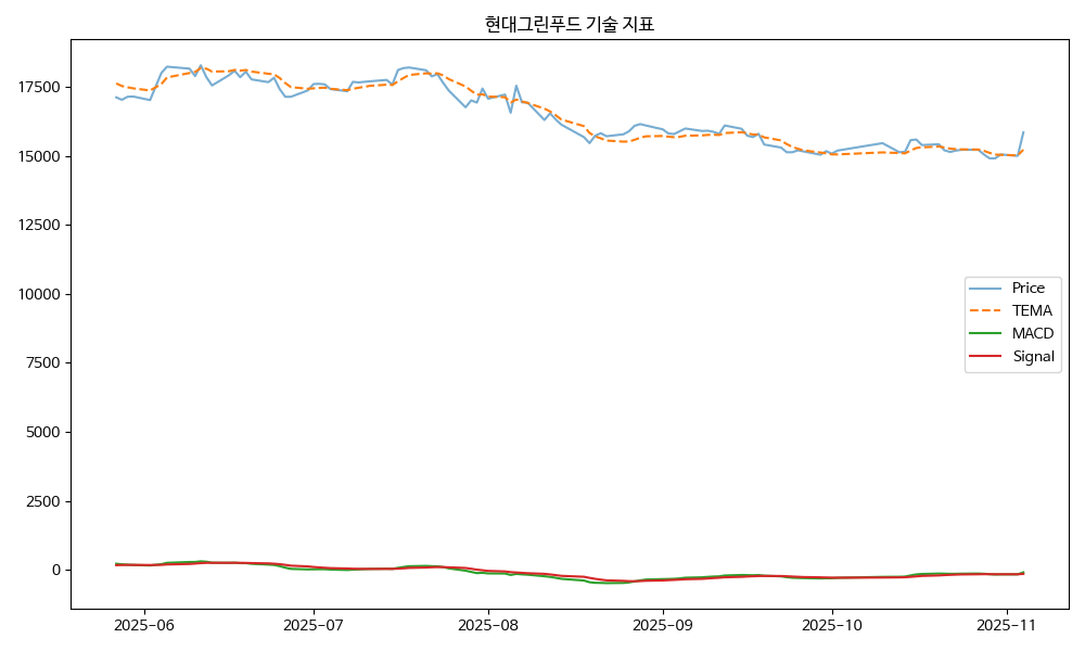 - TEMA: 현재가 15850.00, TEMA 15220.88 → 상승 흐름