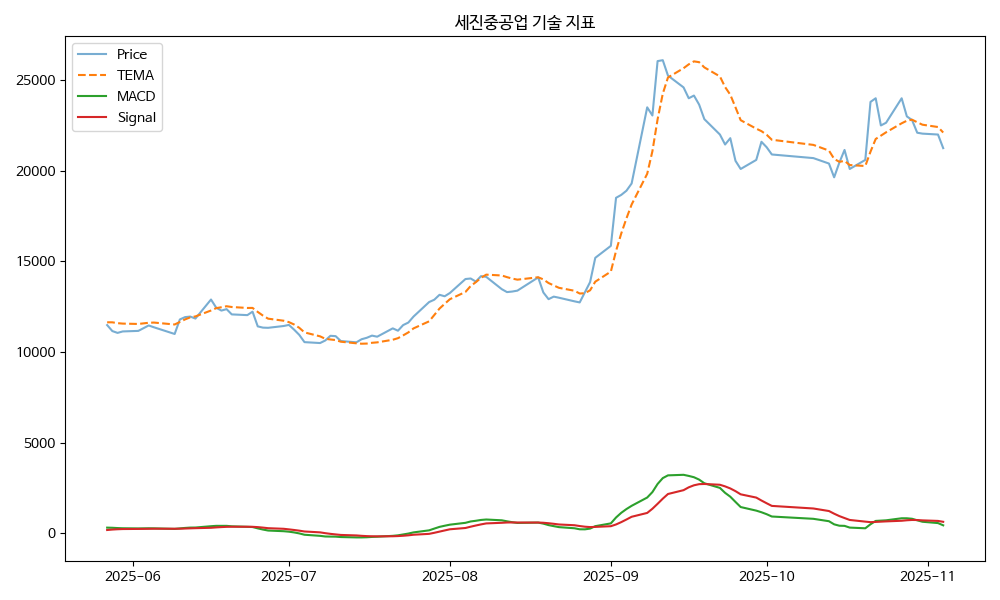 - TEMA: 현재가 21250.00, TEMA 22110.72 → 하락 흐름