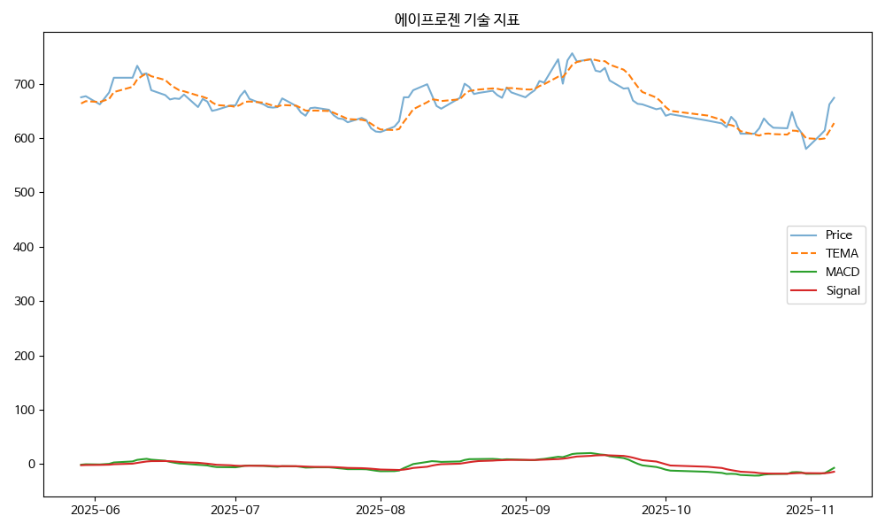 - TEMA: 현재가 674.00, TEMA 627.48 → 상승 흐름