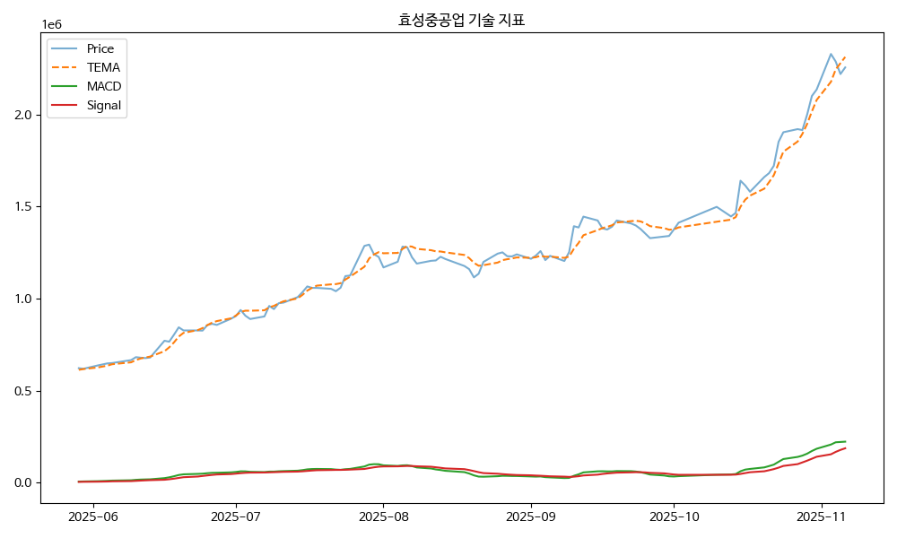 효성중공업 주가가 최근 상승세를 보이고 있습니다. AI 예측 점수는 0.73로 안정적인 상승이 예상되고 있습니다. 특히, 이 종목은 Golden Cross와 MA Ratio와 같은 기술 지표들이 긍정적인 신호를 보여주고 있습니다. 또한, Force Index와 VWAP, Momentum 5도 상승 추세를 확인할 수 있습니다. 이 종목은 최근 전력수요 증가로 인해 호실적을 기록하고 있으며, 미국 송전망 전력기기 계약 수주에도 긍정적인 영향을 받고 있습니다. 뉴스 감성 점수도 1.00으로 매우 긍정적인 반응을 보이고 있습니다. 따라서, 투자자들은 이 종목에 대해 긍정적인 전망을 가질 수 있을 것입니다. 종목의 RSI와 MACD와 같은 기술 지표들도 상승세를 보여주고 있으니 참고하시기 바랍니다.