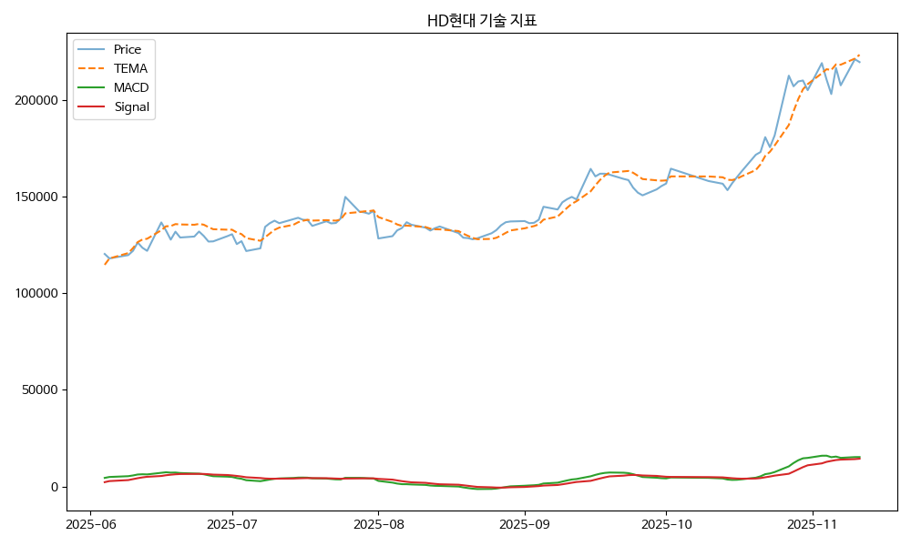 HD현대 주가 차트 (2025년 11월 12일 기준) - 인도 해군 시장 진출 및 대형조선 수주 확대 기대. RSI 65 안정, MACD 상승 신호, TEMA 하락 흐름.