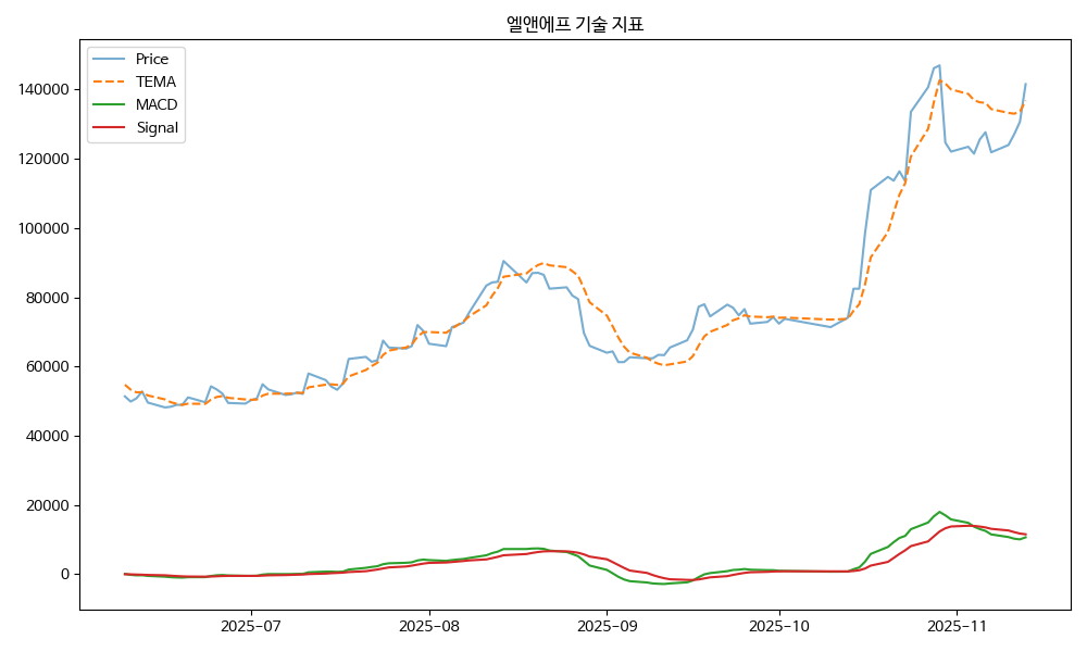 - TEMA: 현재가 141600.00, TEMA 136862.91 → 상승 흐름