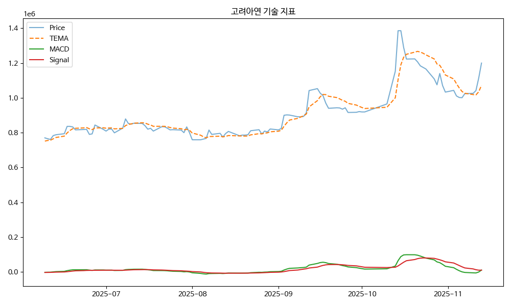 - TEMA: 현재가 1200000.00, TEMA 1071920.57 → 상승 흐름