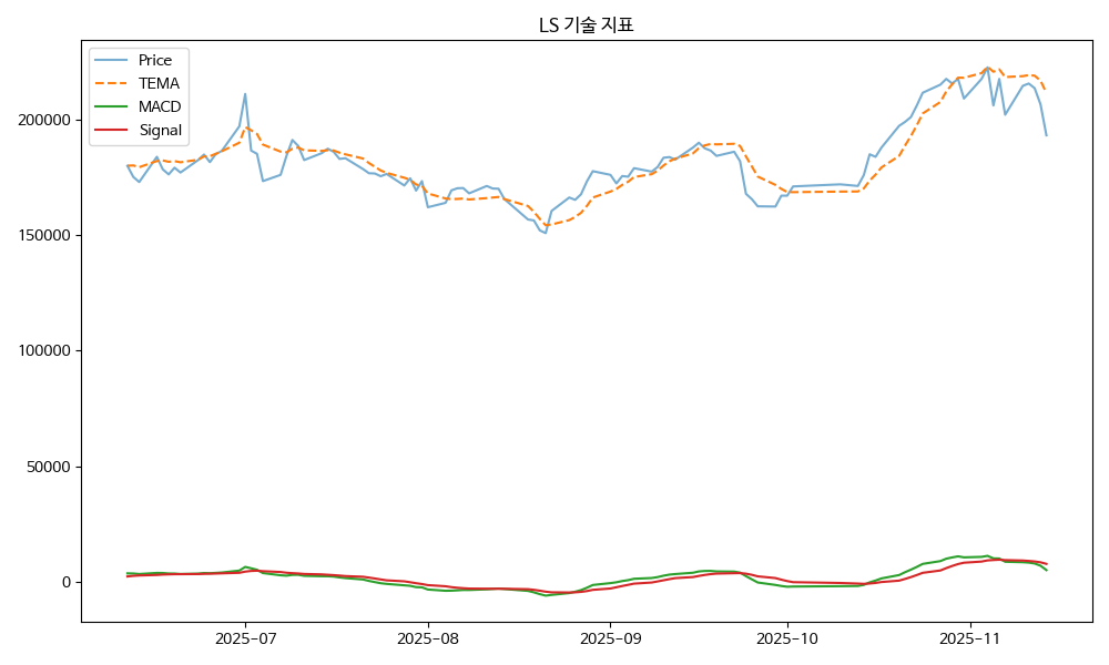 LS 주가 차트 (2025년 11월 17일 기준) - 지역사회 기부활동과 그룹 이슈 긍정 반영. RSI 39 안정, MACD 하락 신호, TEMA 하락 흐름.