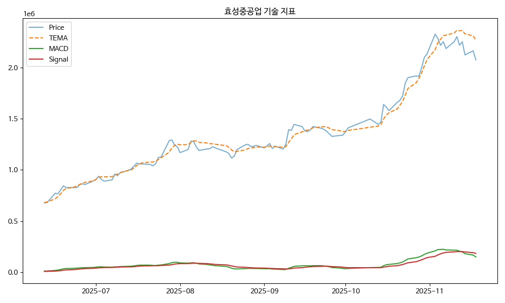 이번 뉴스는 긍정적인 감성 점수를 받았으며, 기술 지표들도 대체로 상승세를 보이고 있어 투자자들에게 효성중공업에 대한 긍정적인 전망을 제공하고 있습니다. 다만, 상승세가 계속될지를 확인하기 위해서는 상대강도지수(RSI)나 이동평균수렴확산(MACD)과 같은 추가 지표들을 더 자세히 분석해볼 필요가 있습니다.