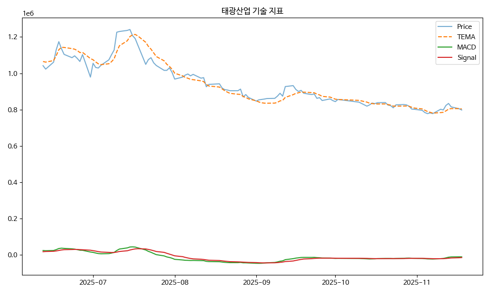태광산업 주가 차트 (2025년 11월 19일 기준) - 남대문 메리어트 호텔 인수 본계약 체결로 투자심리 개선. RSI 42 안정, MACD 상승 신호, TEMA 하락 흐름.