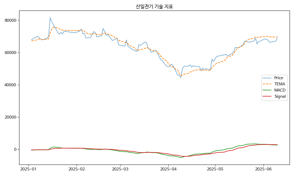산일전기는 전기제어 시스템을 전문적으로 제조하는 기업으로, 주력 제품은 전력 변압기와 특수 변압기입니다. 최근 매니저의 HOT종목으로 손꼽히며 주목받고 있습니다. 기술적 분석에서는 골든 크로스(Golden Cross)와 이동평균 비율(MA Ratio)이 긍정적인 신호를 보이고 있으며, 포스 지수(Force Index)와 볼린저 밴드 폭(BB Width)도 상승세를 보이고 있습니다. 또한 %D 지표도 양호한 상태를 유지하고 있습니다.