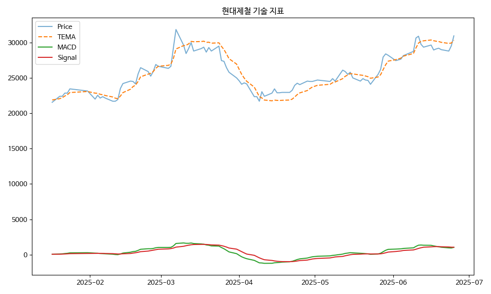 현대제철 주가 분석 차트 (2025년 6월 25일 기준) - RSI 69.19, MACD 하락 신호. 당진 종합병원·자사고 설립 뉴스 반영.