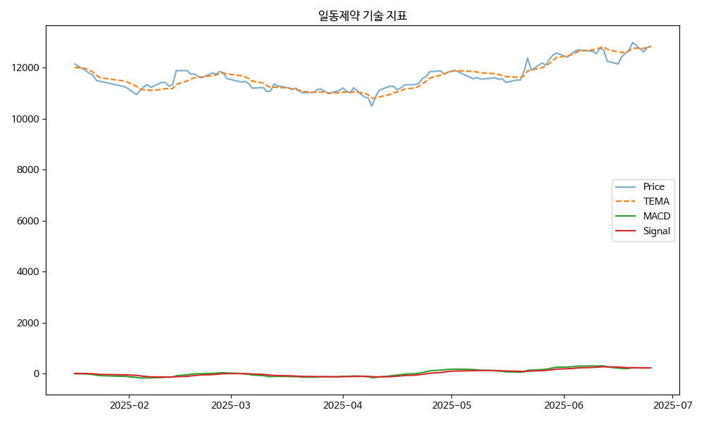 일동제약 주가 기술적 분석 차트 (2025년 6월 25일 기준) - MACD 혼조, TEMA 상승 흐름 진입. 비만약 임상 결과 뉴스와 함께 분석.